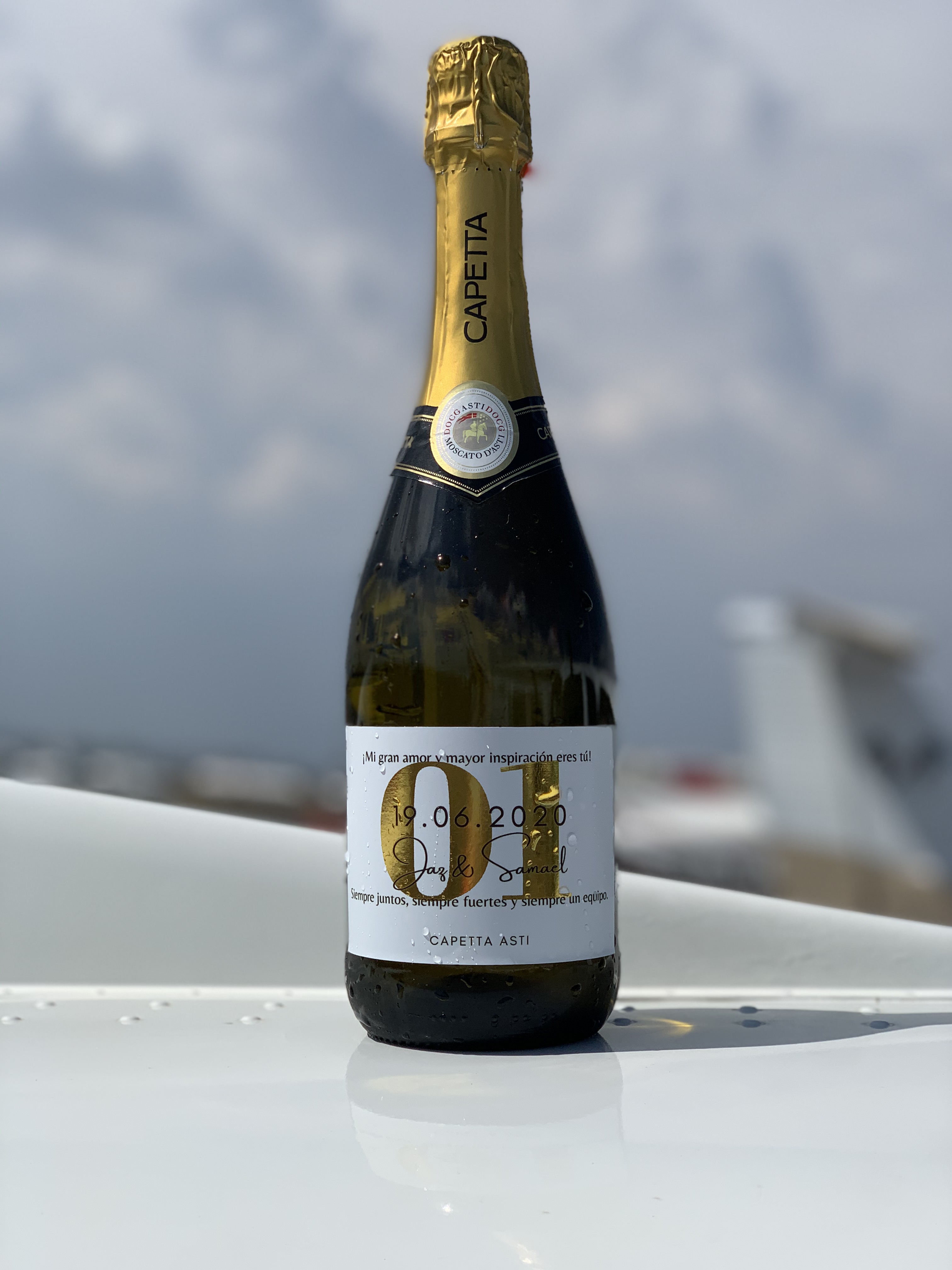 ✅1 botella de vino espumoso PERSONALIZADA para brindar durante el vuelo